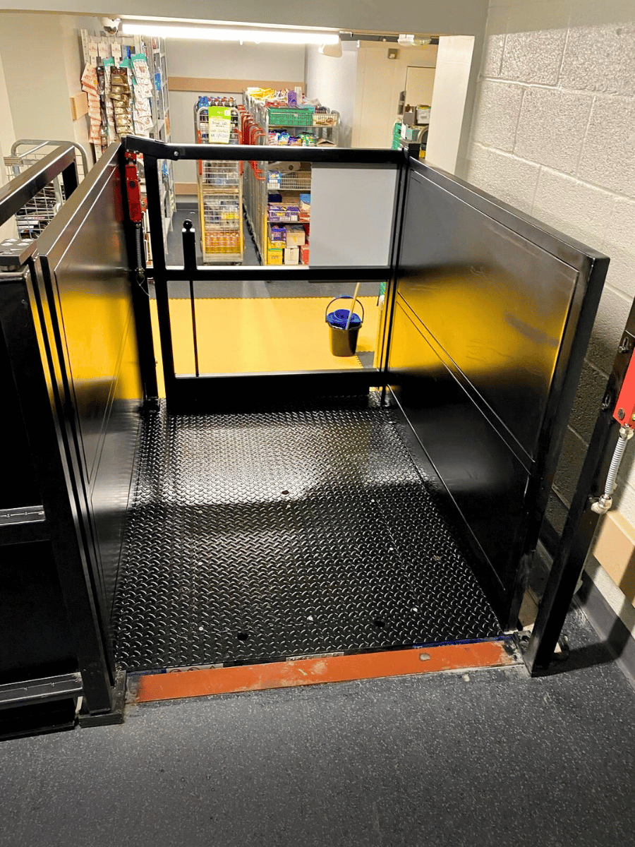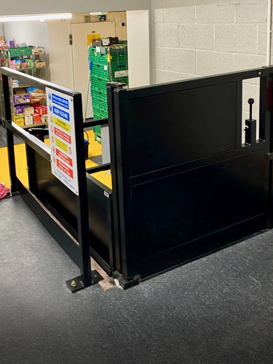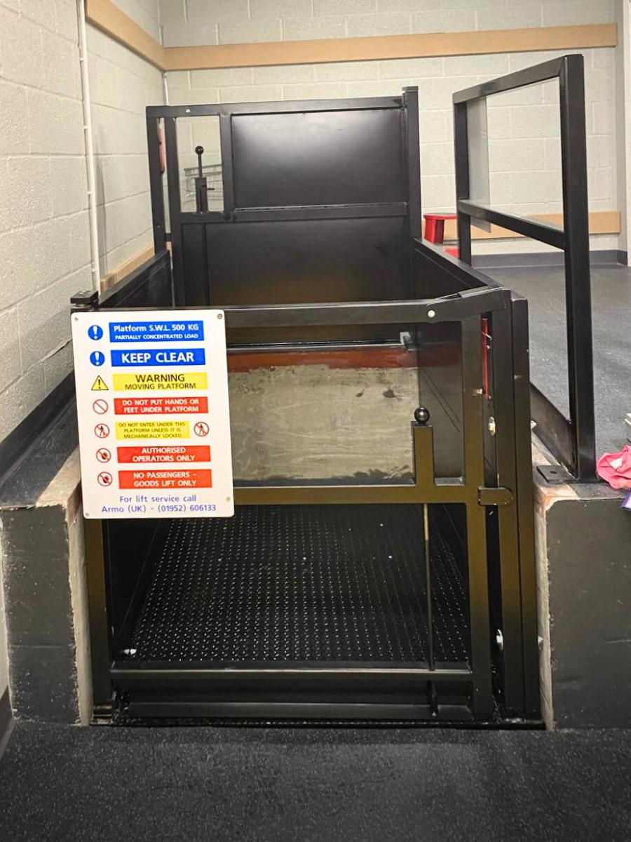 Goods lift installation completed for a supermarket in Castle Cary, the Model ARGL lift is used to transfer goods from stock level up to shop floor level.